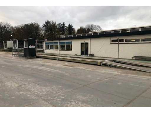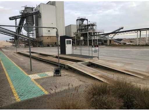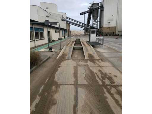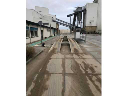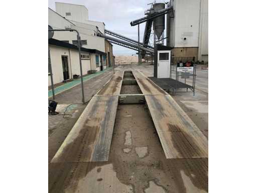 Équipée de rampes et lecteur DD700, cellules de charge analogiques, pont de pesée de 18 mètres, rampes de 4 mètres de chaque côté, 3 mètres de large, 70 tonnes, démontable.