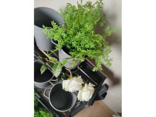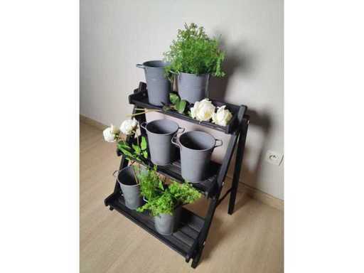 Porte-plantes (1x) + seaux fleuristes (6x) + plantes artificielles