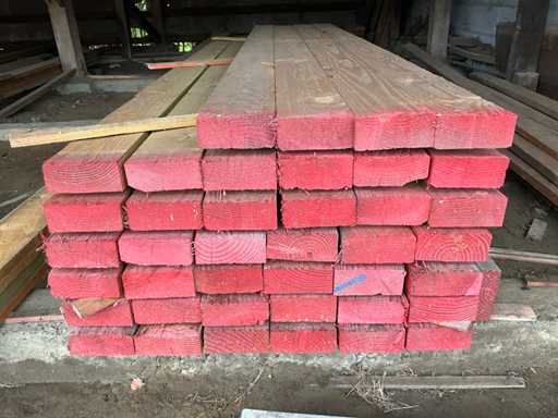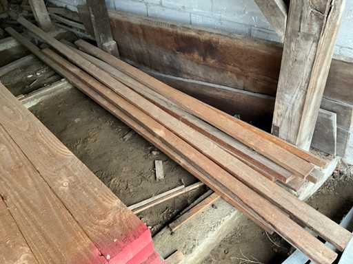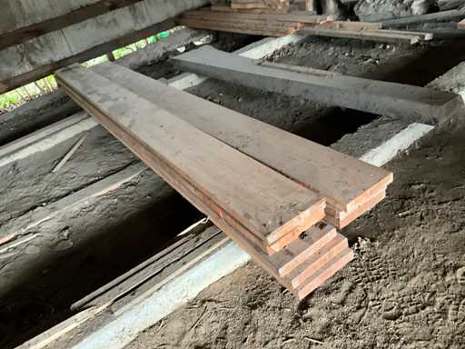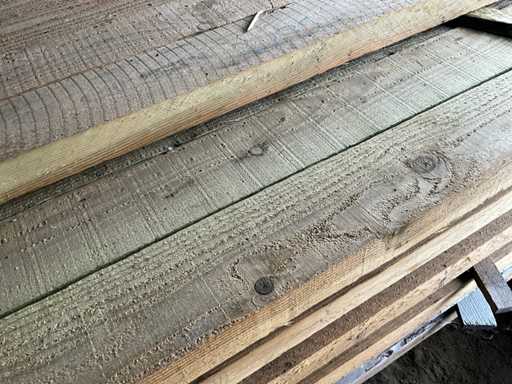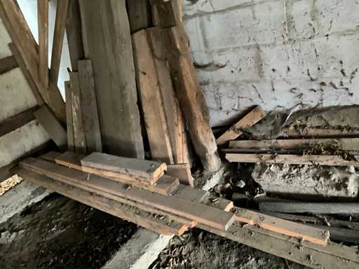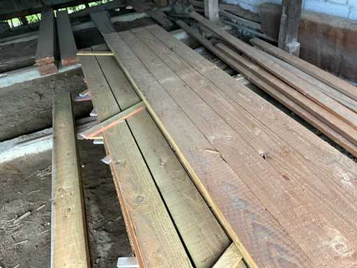 Avec diverses planches de bois de pin, dont 8x dimensions 330x23,5x4cm + 4x 300x17x3cm + divers