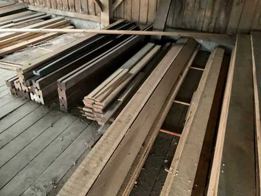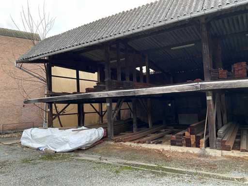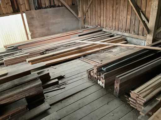 Incluant une largeur d’environ 19x avec des dimensions 18x300x6,5 cm ; 9x largeur 17x 360x6,5cm ; environ 300 fois les poutres, planches et lattes variées, y compris le max. longueur d’environ 540 cm, avec divers poteaux en bois franc Canberra avec rainures.