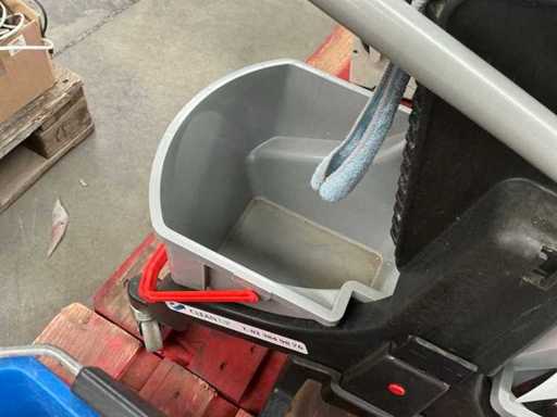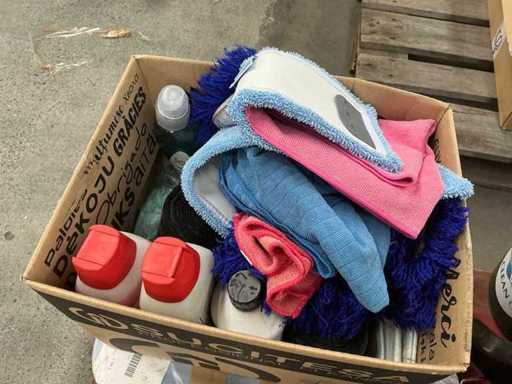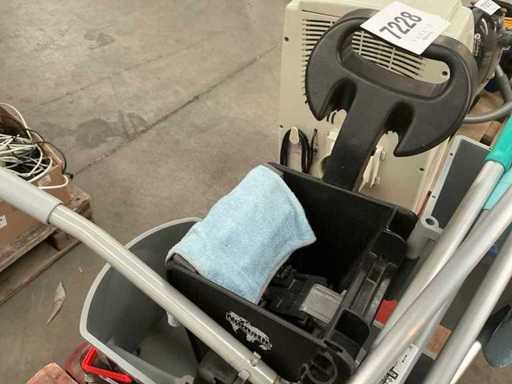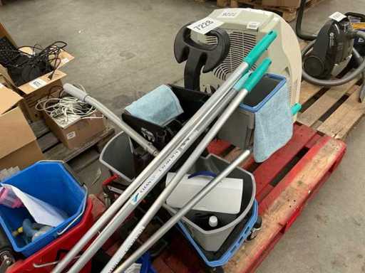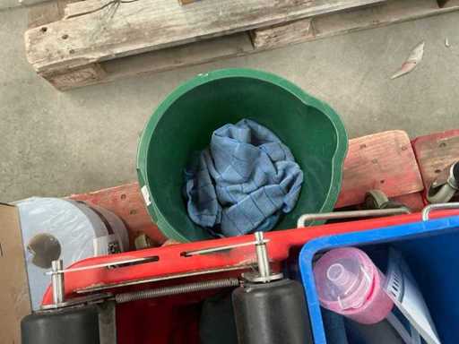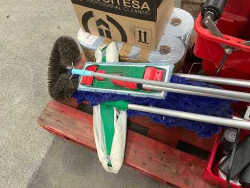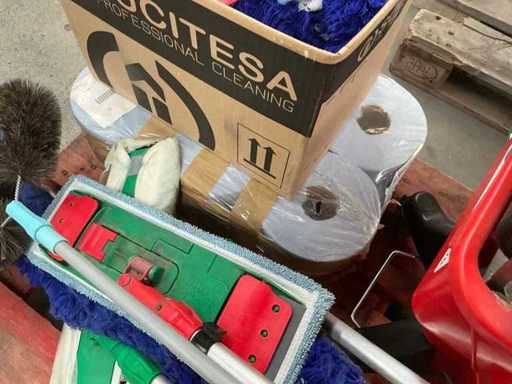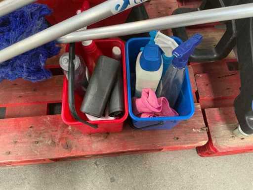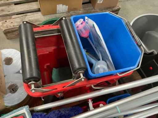 Y compris 2 chariots de nettoyage mobiles, des rouleaux de papier et divers produits.