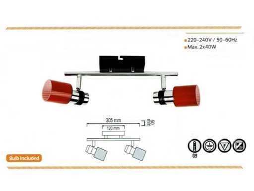 4 x projecteurs doubles de plafond modèle HL7152 – Prise G9 – Puissance maximale 2 x 40W – Dimensions : 305 x 60 mm – Couleur : Rouge – Protection : IP20 – Tension : 220-240V (50/60 Hz) – Ampoules incluses – Adaptées à l’intérieur : salons, chambres, couloirs et espaces décoratifs.