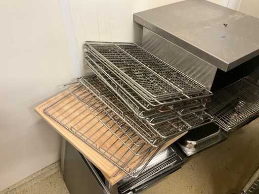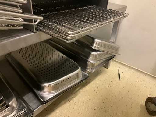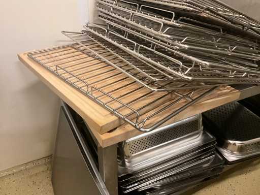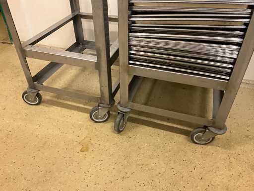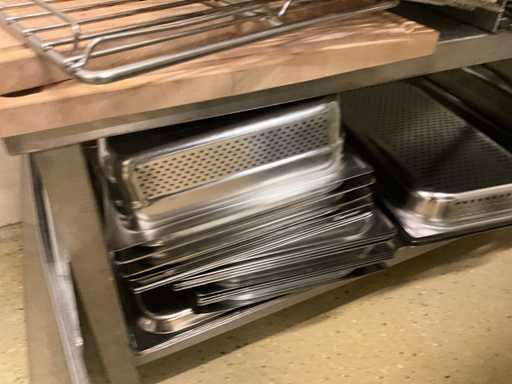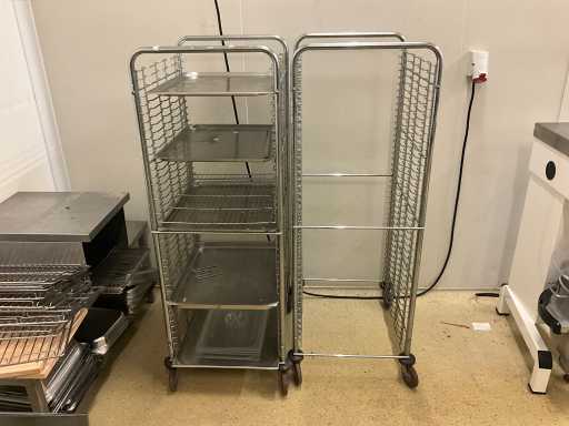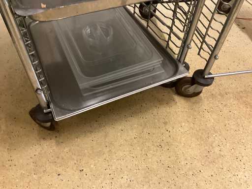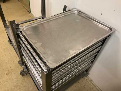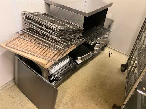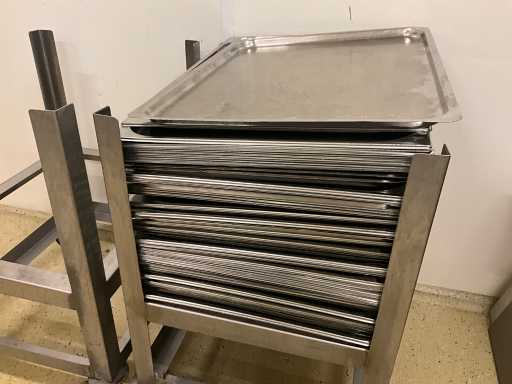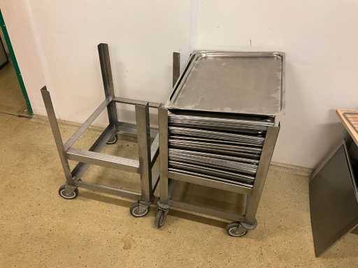 Remorques plates-formes / chariots empilables en acier inoxydable comprenant 2 niveaux vv 40 et 2 empilables, avec lot de divers bols, grilles et plateaux gastronorm couchés dans et sur une table basse en acier inoxydable