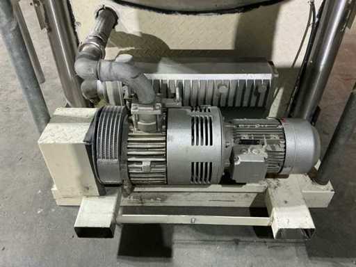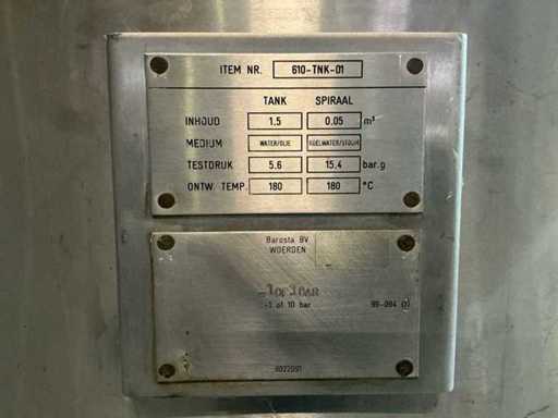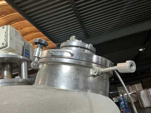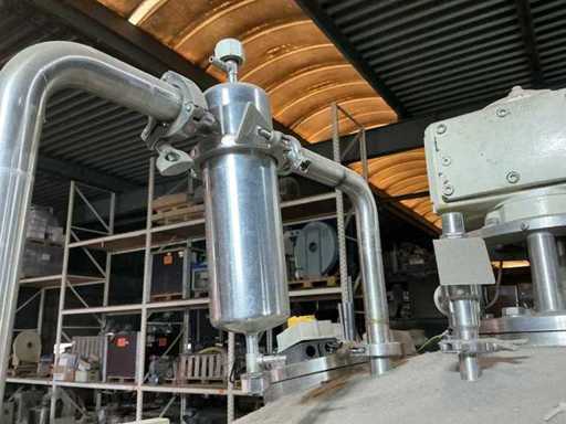 Comprend : chaudière à vide, avec agitateur, mesure de température, réservoir à double paroi, chauffable, détecteur de position, filtre de séparation, vanne à dépression de 1500 litres, pompe à vide, châssis avec creux pour fourches palettes, Contenu : 1,5 m³, milieu : eau / huile, pression d’essai : 5,6 bar(g), température de conception : 180 °C, plage de pression : -1 à 10 bar, spirale (échangeur de chaleur), capacité : 0,05 m³, moyen : eau de refroidissement / vapeur, pression d’essai : 15,4 bar, Réservoir cylindrique vertical en acier inoxydable, monté sur un cadre de support en acier, est équipé d’un échangeur de chaleur intégré (spirale) pour le contrôle de la température du produit, sur le dessus se trouve un couvercle d’inspection / bouche d’égout et un entraînement pour agitateur ou dispositif de mélange (si utilisé). Une pompe mécanique (pompe à vide ou à circulation) est montée sous le réservoir pour le transport du produit ou le support du procédé.