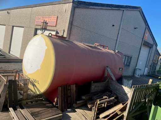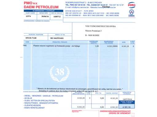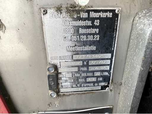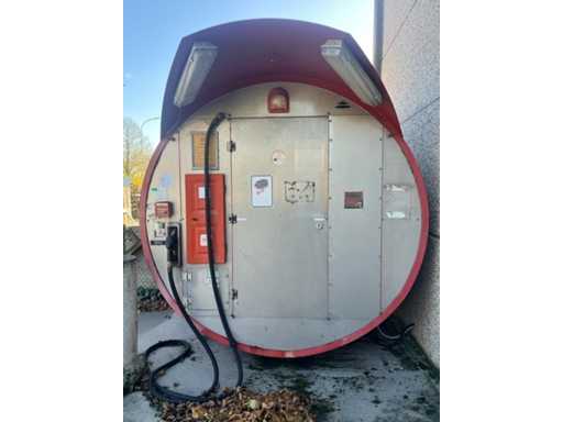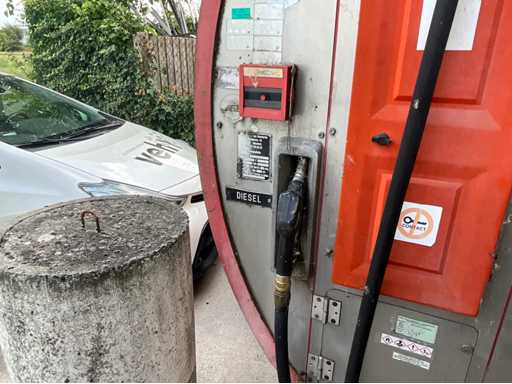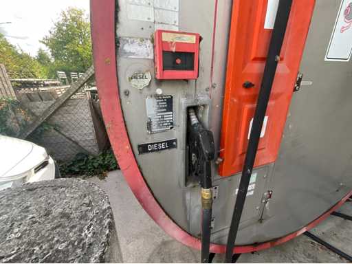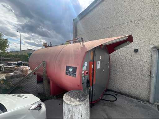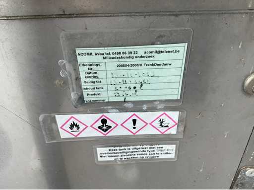 Généralités: • Type d’installation : Réservoir de diesel hors-sol avec installation par pompe. • Contenu : Le réservoir indique « 15 150 L » → 15 150 litres de capacité de stockage de diesel. • Produit : Diesel (indiqué à la pompe et sur l’autocollant d’inspection). Emplacement et fournisseur (installation de mesure de plaques) : • Marque pompe/installation de mesure : Petposan • Installateur : Buba Afj. J. Van Moerkerke, Diksmuidsesteenweg 43, 8800 Roeselare. • Téléphone : 051/20.30.23 • Type : 3F • Produit : Liquide (liquide, ici diesel). • Débit max. : 50 L/min. • Pression de service max. : 3,2 bar. • Numéro d’agrément : 019-96. Panneau de configuration: • Contrôleur électronique Gespa GK-7 avec clavier pour le contrôle d’accès (saisie de code). • L’écran affiche la date/l’heure et l’instruction « APPUYEZ SUR UNE TOUCHE ». Installations du réservoir : • Équipé d’une protection anti-débordement TRbF 511 (indiquée). • Tuyau de carburant avec pistolet diesel. • Autocollants de sécurité avec pictogrammes de danger : inflammable, nocif pour la santé, dangereux pour l’environnement.