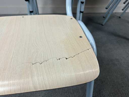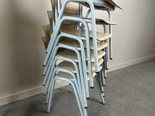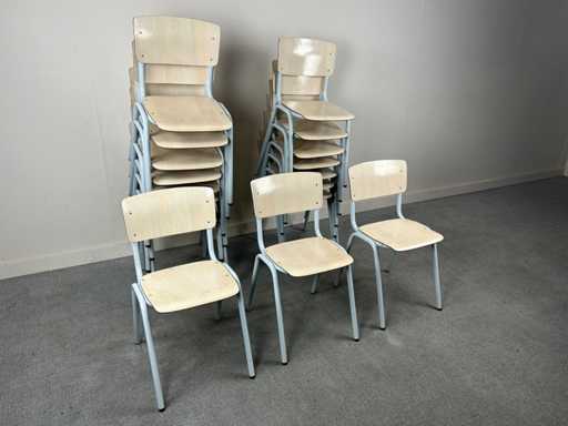 Beaucoup de 19 chaises de cantine empilables / chaises d’école en bois clair.