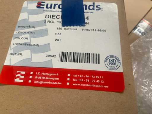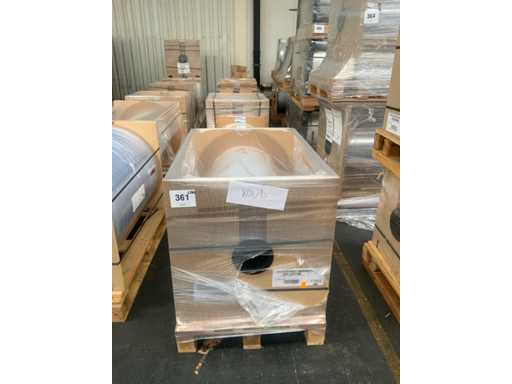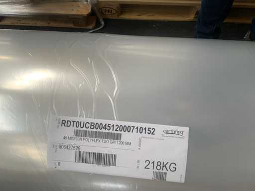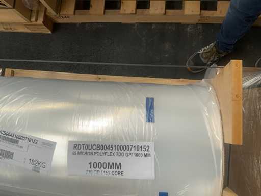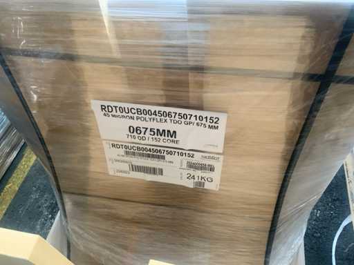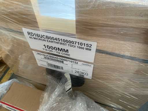 Nombre total de rouleaux : 5 rouleaux - Épaisseur : 50 microns, 45 microns, en différentes largeurs : entre 675 mm et 1200 mm - Comprend une palette avec autocollants d’étiquettes