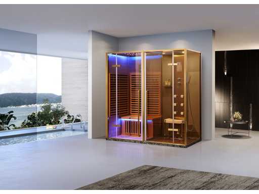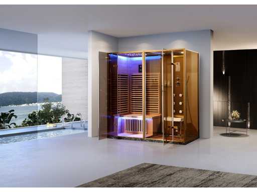 Verre de sécurité de 8 mm, fond en marbre avec insert antidérapant en PVC (dans la zone de vapeur), panneau de commande numérique (dans le sauna et la cabine de vapeur), Bluetooth avec haut-parleurs, drain avec tuyau d’eau flexible, partie sauna 5 panneaux infrarouges total 3500 watts, générateur de vapeur 2500 watts, électricité totale 220v 6000 watts 16a (avec prises plug and play), 6 jets de massage incorporés dans la paroi arrière, Télécommande, espace sauna en bois de pruche. banc adapté pour 2 personnes, thermomètre sauna, divers éclairages LED avec chromothérapie (7 couleurs), cabine à vapeur avec siège design, poignées de porte en acier inoxydable (or), aromathérapie, indication numérique de la température, extraction avec ventilateur, ozone, pression de l’eau réglable, douchette, étagère, robinets en laiton chromé, 2 portes battantes avec suspensions en acier inoxydable massif (or), douche à effet pluie au plafond, douchette à main