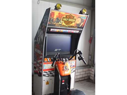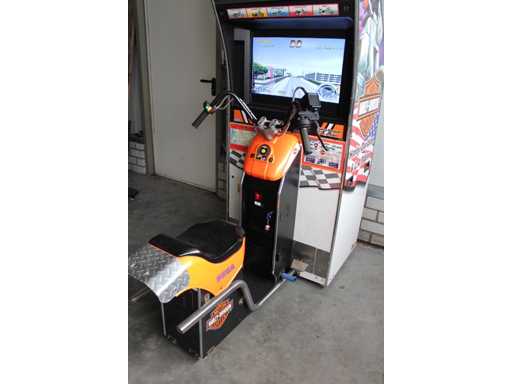 Assieds-toi dans la salle d’arcade, conduis une Harley Davidson et prends le plus de points, jeu libre, un vrai classique