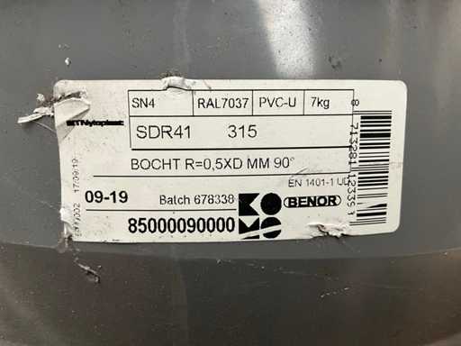 Composé de 7 pièces de courbes en PVC de type SDR41 diamètre 315, courbe R=0,5XD MM 90°, boîte carton 6 x 45°/ in, inutilisée