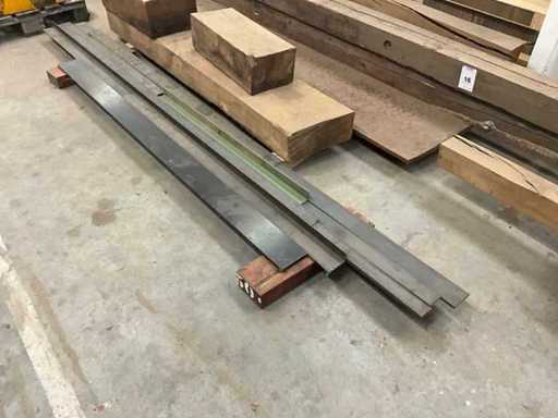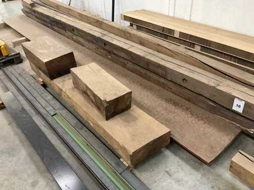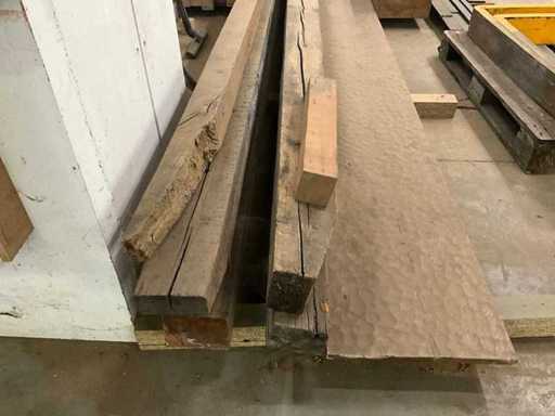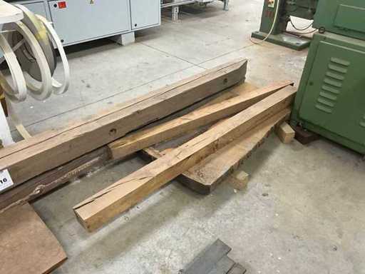 Composé de 4x poutres en chêne de 13x15 cm avec des longueurs de 5-7 mètres, +1x bloc de chêne de 34x14 cm de longueur 180 cm, + paire de poutres plus petites, + fer profilé (fourches élévatrices non incluses)
