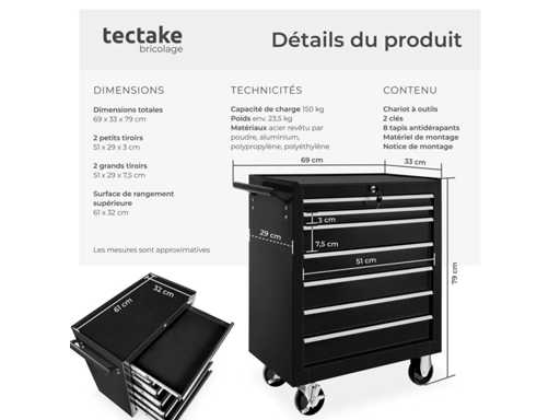 Dimensions des 5 grands tiroirs (LxlxH) : environ 51 cm x 29 cm x 7,5 cm.
