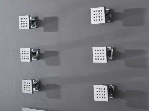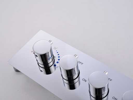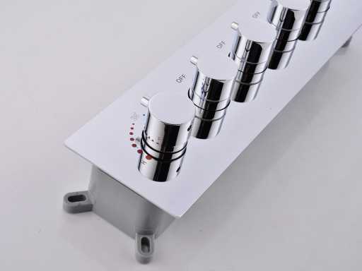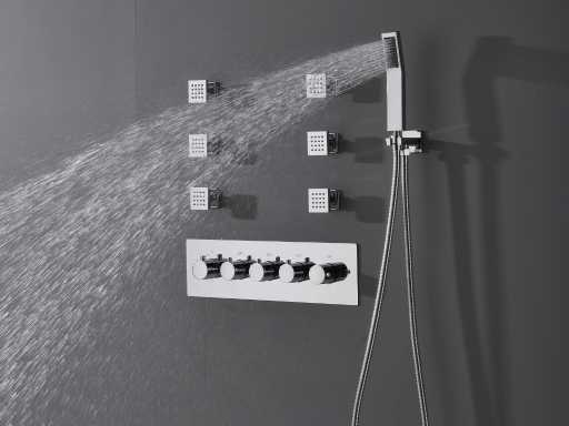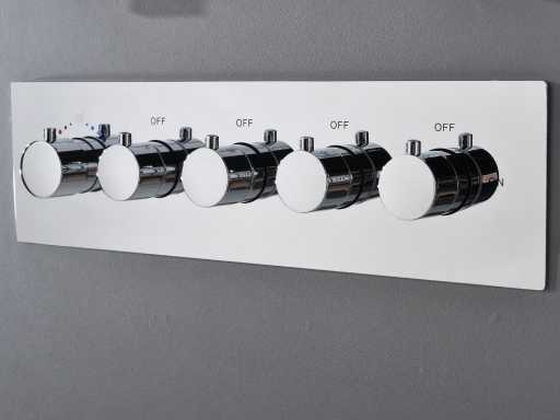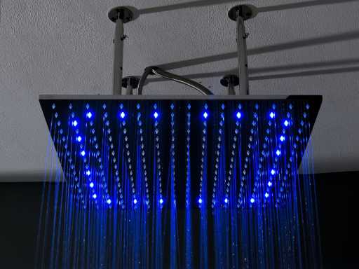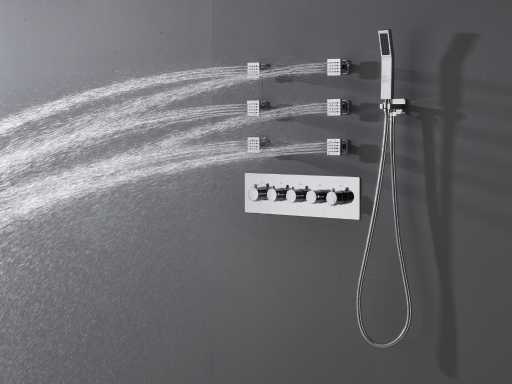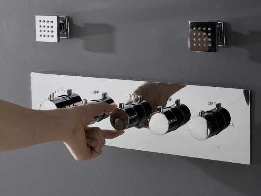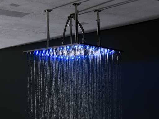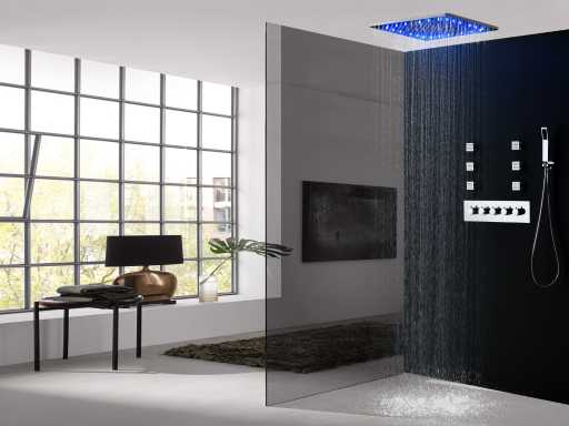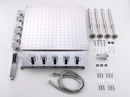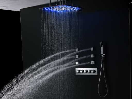 douche à effet pluie encastrable avec robinet thermostatique et jets de massage, Matériau laiton et acier inoxydable 304, Robinet thermostatique à commande intelligente avec 4 boutons de commande, Intérieur en céramique, Pomme de douche 50x50 cm en acier inoxydable 304 et éclairage LED interne, Douchette réglable avec tuyau de douche et suspension en laiton, Équipé de 6 jets de massage en laiton (rotatifs), bec de robinet de bain, dynamo intégrée qui entraîne l’éclairage LED par le flux d’eau, température <25 = couleur bleue, température 25-40 = couleur verte, température >40 = couleur rouge, pomme de douche avec 2 fonctions (nébuliseur et douche à effet pluie) et sorties d’eau en plastique pour éliminer facilement le calcaire, intérieur en céramique bon pour 800 000 fois ouvert/fermé sans fuite, épaisseur de la plaque : 12 UM, pression de travail : 2-16kgf/cm2, température de fonctionnement : 0 à 90 degrés Celsius, traité anti-calcaire, État : neuf dans la boîte, Caractéristiques spéciales Garantie de 2 ans, Les douchettes de haute qualité, les douchettes et les jets de massage peuvent tous être utilisés/contrôlés simultanément ou séparément