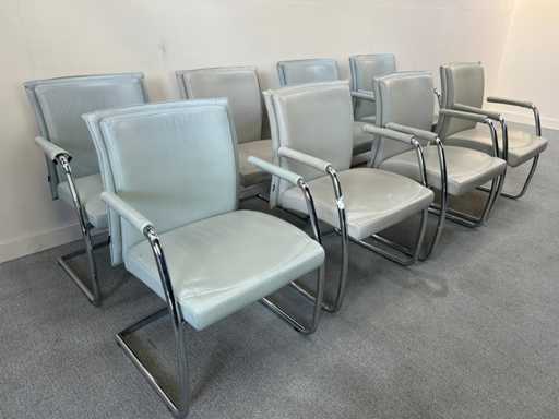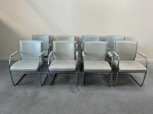 Lot de 8 chaises de réception cantilever SHETUG en cuir gris. Avec des signes d’usure, l’état peut varier d’un article à l’autre.