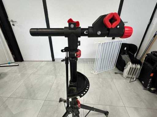 Hauteur réglable, pince rotative à 360°. Boucles à libération rapide avec verrouillage rouge. Base pliable. Étagère à outils disponible. Doublure en caoutchouc dans la serre du cadre. Adapté à l’entretien et à la réparation de vélos. En bon état d’occasion. De légers signes d’utilisation visibles. Manuel disponible (voir photo).