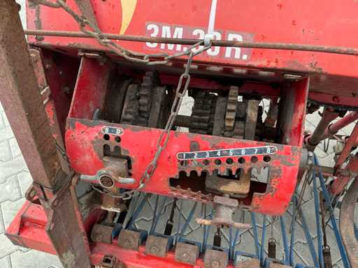 Équipé de : 33 sorties, marqueur à gauche et à droite, suspension à 3 points, dents na-eg, entraîné mécaniquement, puissance réglable mécaniquement, large de 3 mètres.