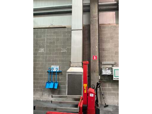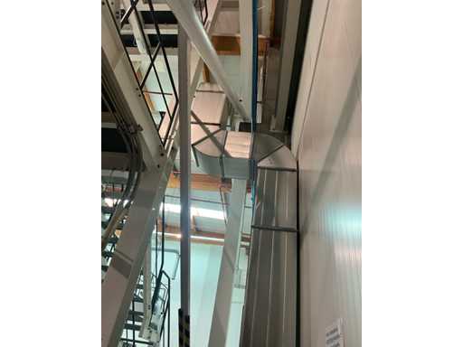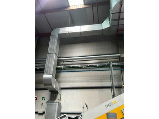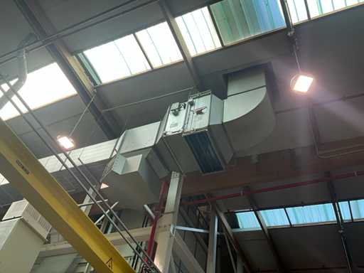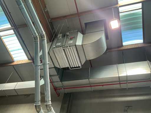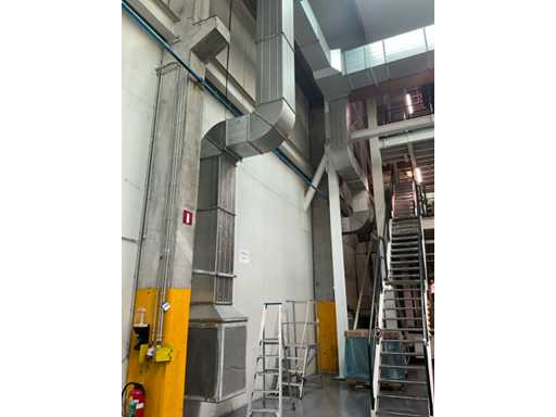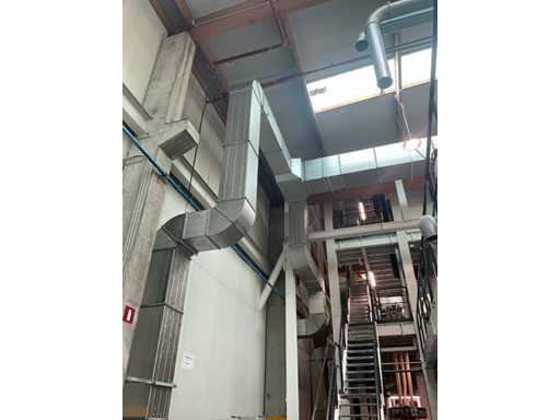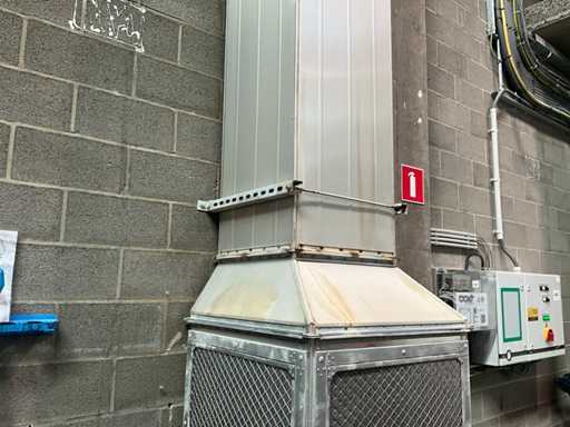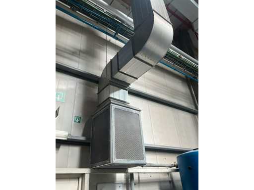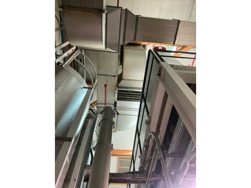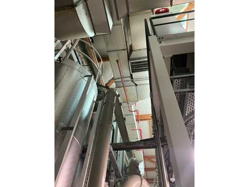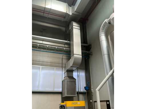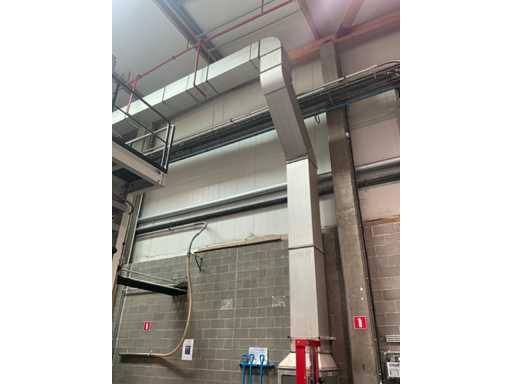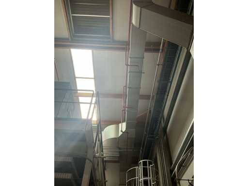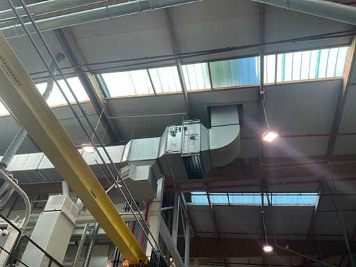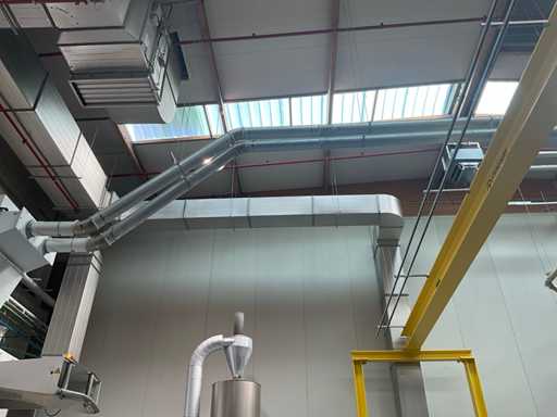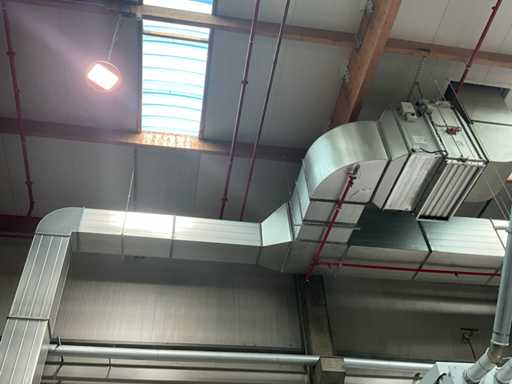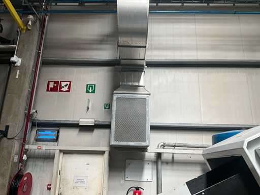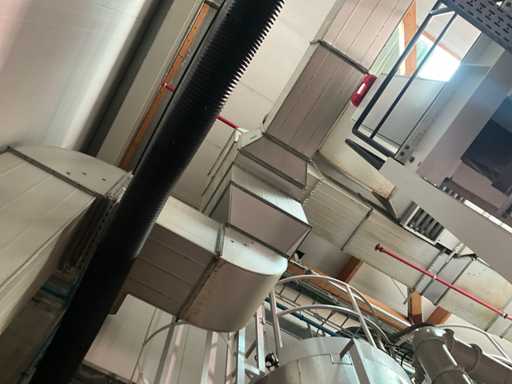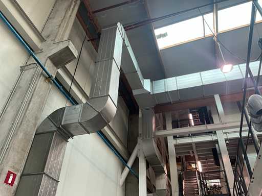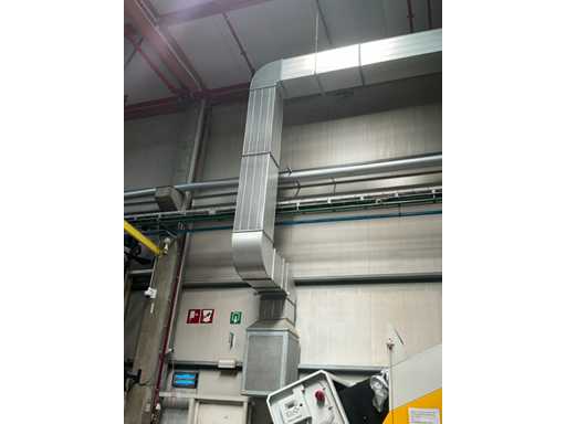 Système complet de refroidissement et de ventilation, composé d’environ 125 lpm carrés/rectangulaires tuyaux/conduits en acier inoxydable pour le refroidissement de différentes tailles, situés à une hauteur d’environ 9 à 10 lpm dans le hall d’extrusion, y compris divisé en 3 configurations/circuits, dont 1 avec 5x bandes avec tuyaux/conduits de la hauteur du plafond vers le bas, chacune d’une hauteur d’environ 9 lpm y compris les coudes nécessaires et en bas chacun équipé d’un module de grille de filtre complet avec 2 conduits centraux sur le largeur de la salle dont celle-ci avec un module supplémentaire d’air mixte et de ventilateur en haut et 2 avec 3x une version idem le long de l’autre côté de la salle. Tous deux équipés d’un module d’air mixte et de ventilateur en haut des circuits avec sortie vers l’extérieur le long du toit. Ces 3 ouvertures doivent être fermées par l’acheteur après le démontage du système/installation.