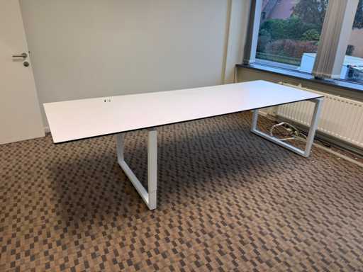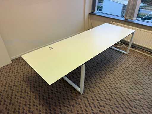 Long bureau avec un plateau de table en mélamine blanc allongé (260x90) et une base robuste en forme de jambe en O, hauteur réglable manuellement de 62 à 85 cm