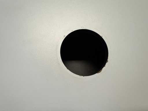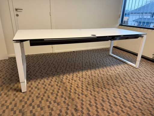 Table de bureau avec un plateau en mélamine blanche (220x90) et une base solide en O, hauteur réglable manuellement de 62 à 85 cm et équipée d’une entrée par câble.