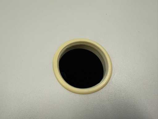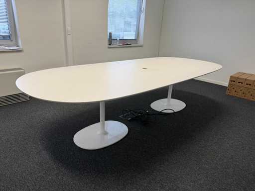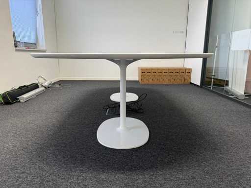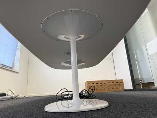 Table de conférence ovale en plastique blanc avec double pied central avec plaque de plancher. Quelques signes d’usure sont présents.