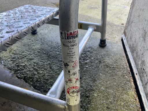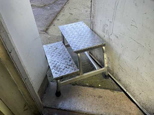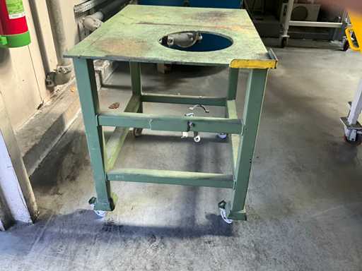 Table mobile en métal d’environ 100 x 73 x 90 cm de haut, avec ouverture dans le haut d’un diamètre de 30 cm, complète avec marchepied à 2 marches en version à tôle striée en acier inoxydable.