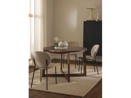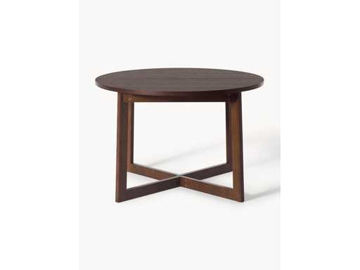 Dimensions globales : Ø 115 cm, haut. 75 cm Épaisseur du plateau : 3 cm Pieds : 65 cm Largeur après extension : 215 cm Poids : 62 kg Charge maximale : 150 kg Couleur Bois foncé Matière Plateau : MDF avec placage en bois de chêne, laqué Pieds : bois de chêne massif, laqué Ce produit est fabriqué à partir de bois certifié FSC® issu d'une exploitation durable Instructions Produit livré à plat, nécessite l'assemblage des pieds