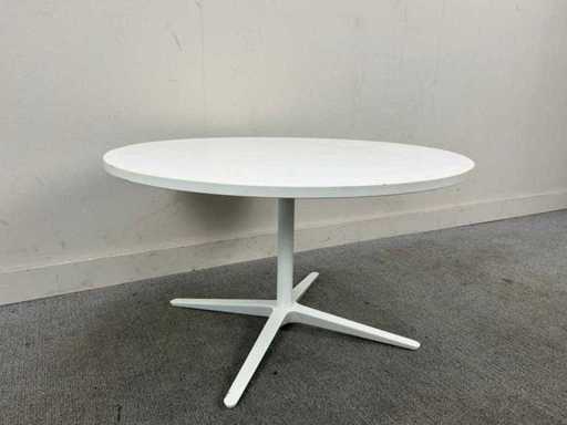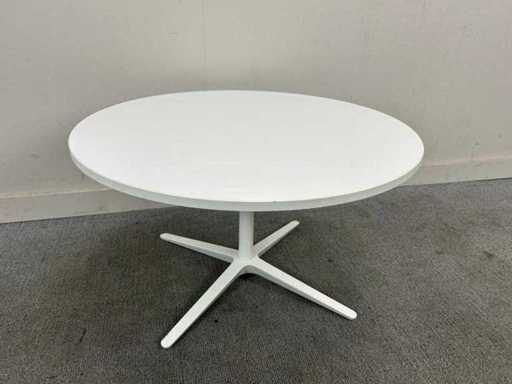 Table ronde blanche sur fond blanc avec un dessus en mélamine d’un diamètre de 80 cm. L’état peut varier au moment du takeaway