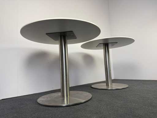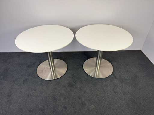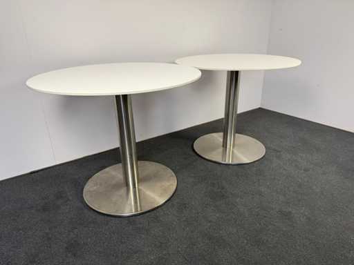 Duo de tables rondes blanches (diamètre 90 cm) sur pied métallique central avec plaque de sol ronde.
