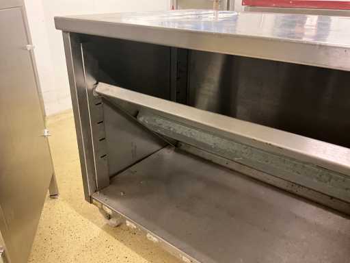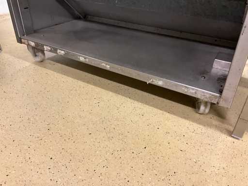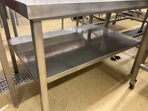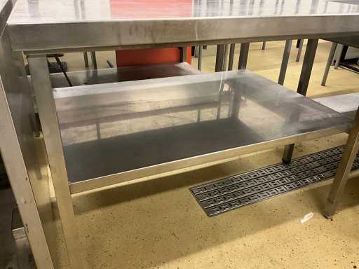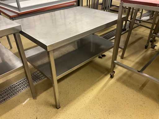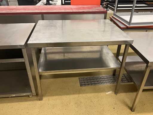 3 différentes tables en acier inoxydable dont 1 mobile, toutes les étagères VV 1 incluant avec AFM PLM:120x74x85cm, 112x85x86 cm, 110x85x75 cm