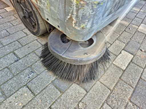 Sans bouteille de gaz ! En état de marche. Équipé d’une brosse principale et d’une brosse latérale, d’un collecteur avec fonction de basculement hydraulique, d’un éclairage et d’un siège conducteur avec ceinture.