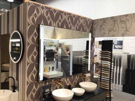 Montrer le mobilier de salle de bain avec double surface solide, lavabo couleur blanc mat 39x14 cm, feuille de couverture composite 150x48,5x2 cm couleur grain royal, meuble bas avec 4 tiroirs 150x48,5x46 cm, vésuvio couleur et miroir avec éclairage LED 150x100 cm.