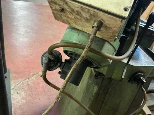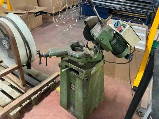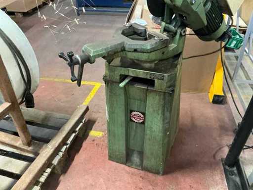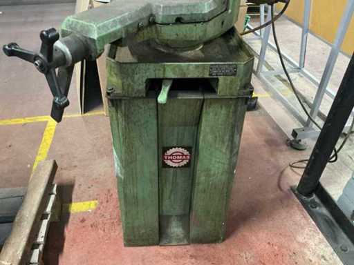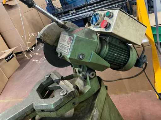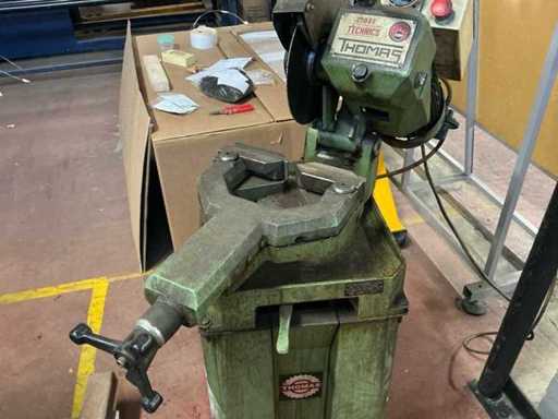 Équipée de : scie industrielle Thomas S.p.A. 250 TDV (type 5/95, année de construction 1995) avec moteur triphasé asynchrone Saccardo, puissance d’environ 0,8 kW (±1,1–1,5 hp), alimentation électrique 380 V 50 Hz, vitesse 700/1400 tr/min, adaptée à la lame de scie Ø 250 mm, version en fonte lourde avec pince mécanique et un poids d’environ 150–200 kg.