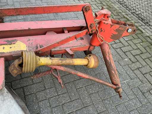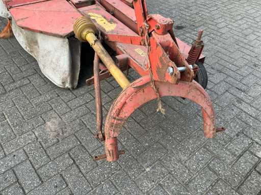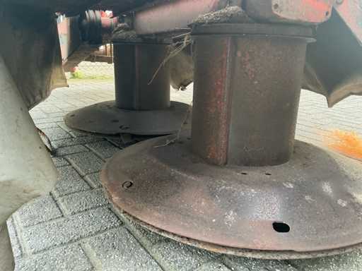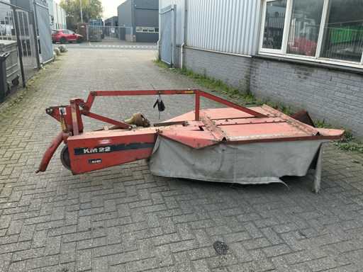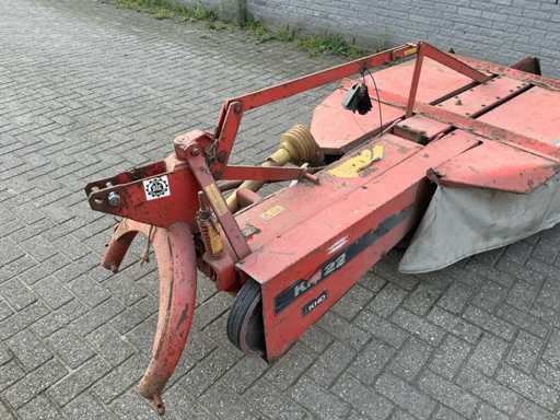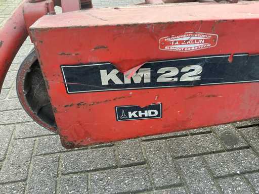 Équipé de : La Kuhn/KHD KM 22 est une tondeuse à disque pliable latérale montée à 3 points, d’une largeur de travail de 2,20 m, cinq disques, un entraînement PTO à 540 tr/min, un poids d’environ 450 à 550 kg, une puissance tractrice requise de 40 à 60 ch, une barre de coupe Kuhn LIFT-Cut et des protections existantes mais usées.