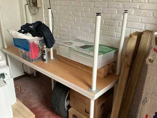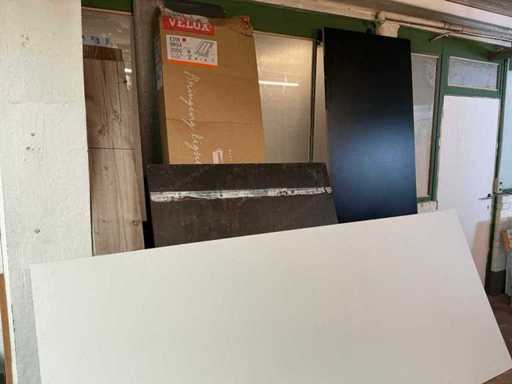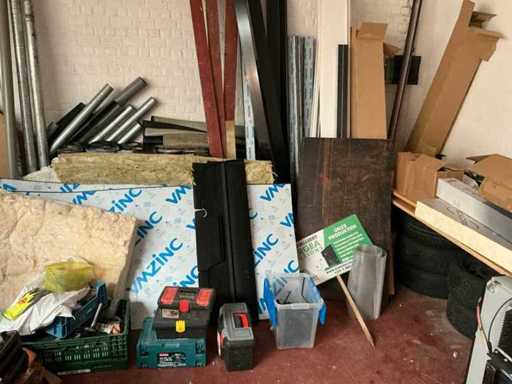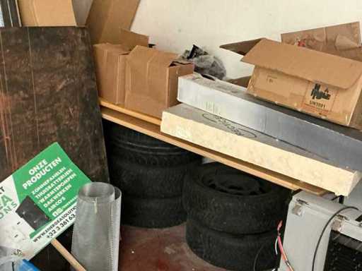 Y compris un lot de lattes de toit en bois, Des gouttières et des descentes pluviales, Profils, matériaux métalliques de fixation pour panneaux solaires, 6 pneus de voiture, dont des jantes en acier/aluminium, 1 table à bière, 2 bureaux d’écriture en placage, 1 porte-plantes en métal, 1 voiture électrique pour enfants et planches en contreplaqué en bois et 1 chaise de bureau en similicuir. À l’exception des lots numérotés et de la conservation du titre, Issue selon les instructions