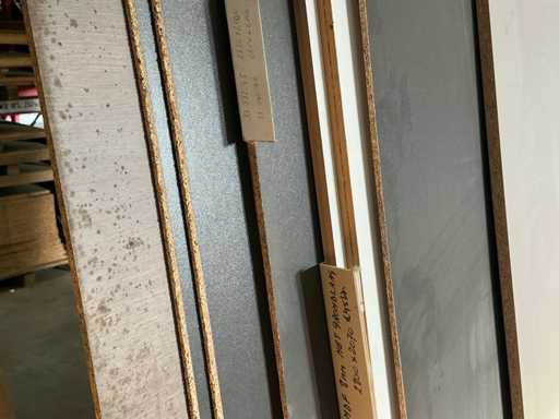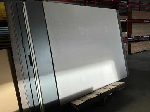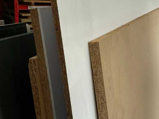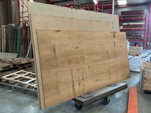 Contenant un lot de diverses planches en bois, dont du MDF noir résistant au feu, du chipboard et des panneaux de mélamine,