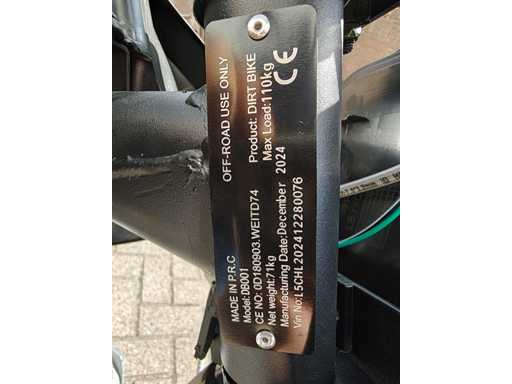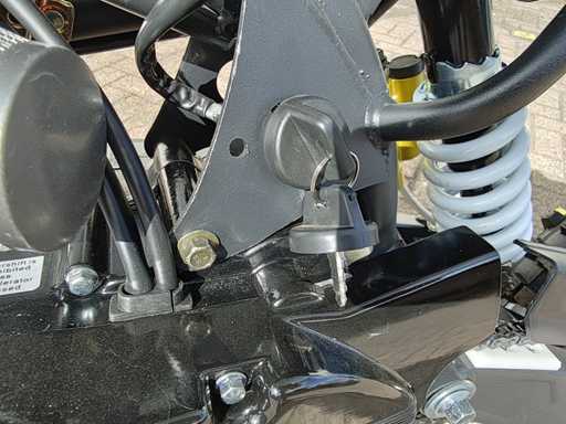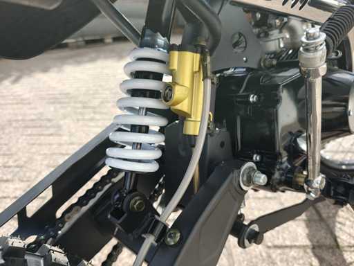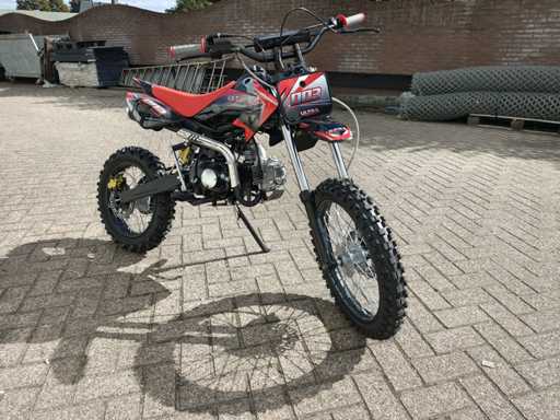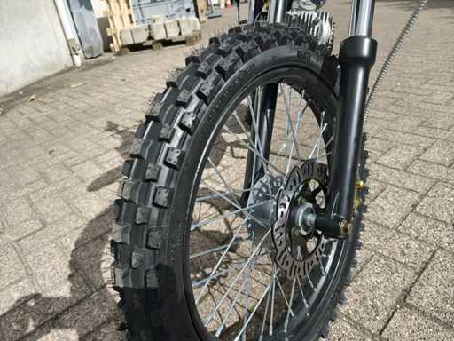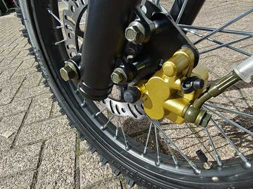 Équipé d’un moteur de 110cc ; Embrayage manuel ; Kickstart ; Roue/jante : V : 90/100-14 (14 ») A : 70/100-17 (17 ») ; Frein à disque hydraulique ; amortisseur d’huile ; Tuyau d’échappement simple en acier ; Vitesse maximale : 70 km/h ; Non utilisé dans la boîte (Emballage de transport : 1295 x 375 x 620 mm 75kg)