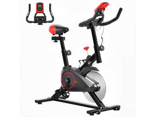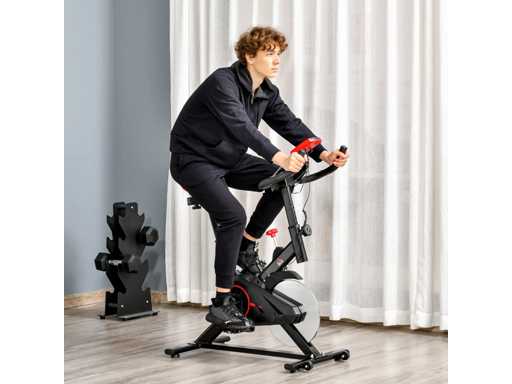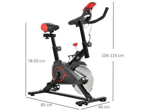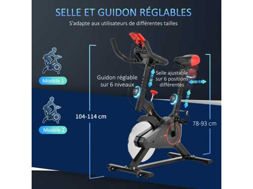 Spécifications: - Couleurs : rouge et noir - Matériaux principaux : acier, ABS - Dim. totales : 85L x 46l x 114H cm - Hauteur selle : 78-93 cm - Hauteur guidon : 104-114 cm - Diamètre volant d'inertie : 3,3 cm - Poids/force d'inertie : 6 Kg - 2 piles AAA nécessaires (non fournies) - Charge max. recommandée : 100 Kg - Certification norme CE (LCD) - Livraison en un colis