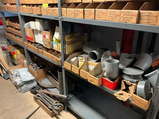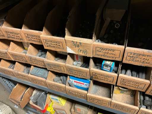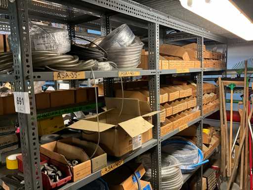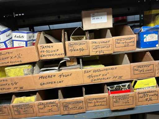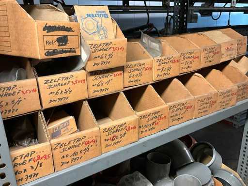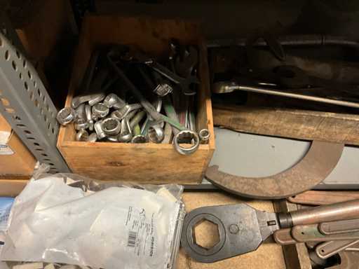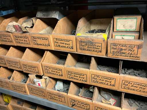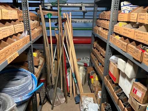 Contenu de l’étagère composé de : boulons, rondelles flexibles, vis de réglage, vis autotaraudeuses, clés à anneau, outils de jardinage, .. est sur le sol