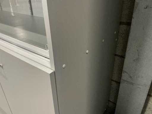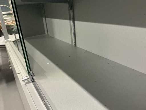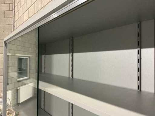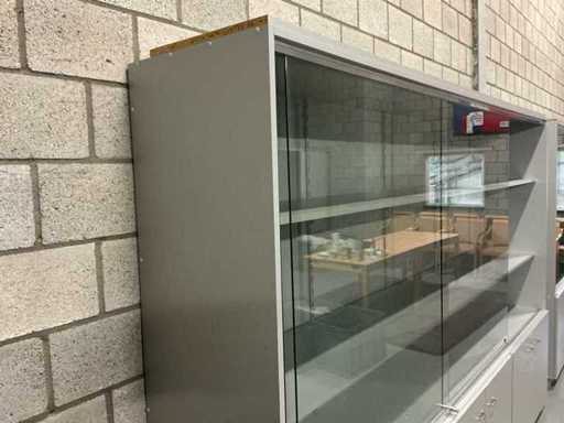 Comprend : vitrine d’exposition, 3 portes coulissantes en verre, 2 étagères, réglables en hauteur, 3 placards sous le plan de travail avec 2 portes chacun,