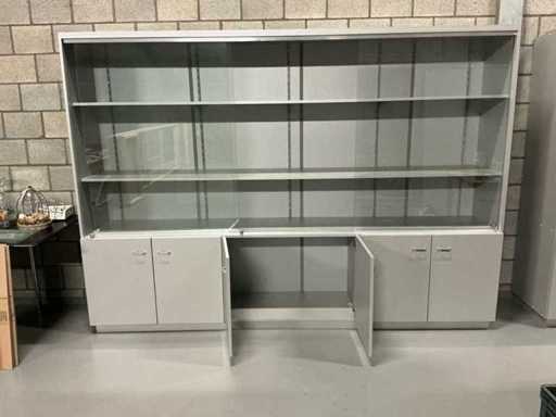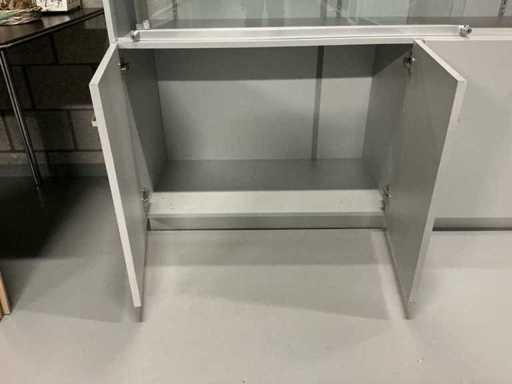 Comprend : vitrine d’exposition, 3 portes coulissantes en verre, 2 étagères, réglables en hauteur, 3 placards sous le plan de travail avec 2 portes chacun,