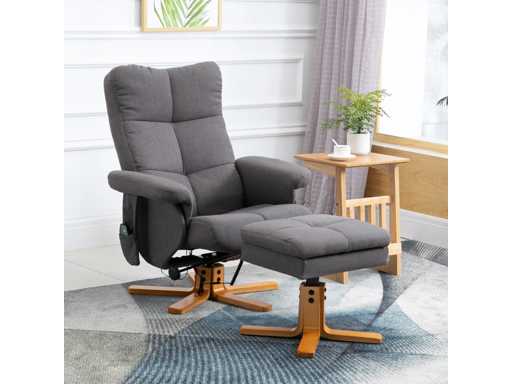 Specificaties: - Materiaal: Polyester, Schuim, Hout - Kleur: Donkergrijs - Totale afmetingen van de stoel: 80L x 86D x 99H cm (zittend), 80B x 118D x 83H cm (liggend) - Zitafmetingen: 50L x 52D cm - Zithoogte: 43 cm - Armleuninghoogte: 56 cm - Hellingshoek: 145° - Voetsteunafmetingen: 47B x 42D x 45H cm - Ingang: 100-240V / 50/60Hz - DC-uitgangsspanning: 12V - Maximale laadcapaciteit: 120 kg (fauteuil), 100 kg (voetensteun)