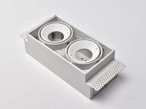 Ledsc4 Multidir duo in trimless armatuur wit randloze design inbouw spots, geschikt voor kantoor, winkel, showroom, ontvangstruimten, ook in woonkamer, de keuken, in slaapkamers, inloopkasten. Kardanisch kantelbaar en in hoogte verstelbaar, dimbaar, geschikt voor alle typen GU10 lichtbronnen (niet inbegrepen). Merk: ledsc4, Type: 71-2946-14-00 / 8435381413408 Minigrid in trimless, Afmeting ca.: 10.7 x 20.4 x 8 cm. Max aantal lichtbronnen: 2. Kardanisch verstelbaar: Ja. Dimbaar: Ja. Inclusief inbouwframe: Ja. Kleur: Wit. Lotwaarde € 1390,-