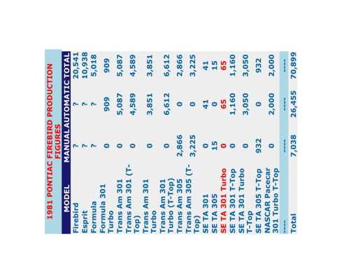 Er zijn in 1981 slechts 65 auto's zonder schuifdak gemaakt en dit is waarschijnlijk de enige auto die zonder lederen bekleding voor de Europese markt is gemaakt. (zie lijsten van GM)