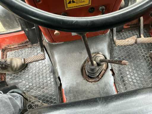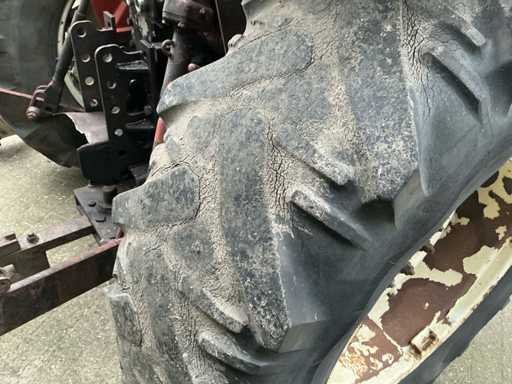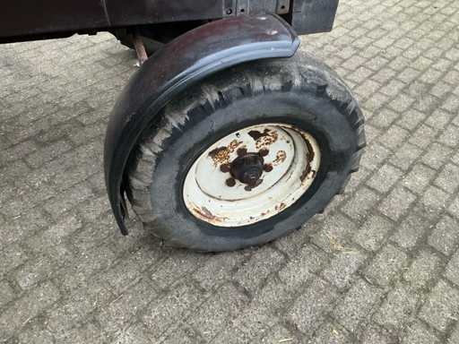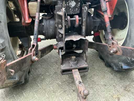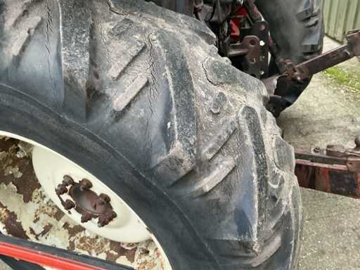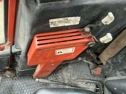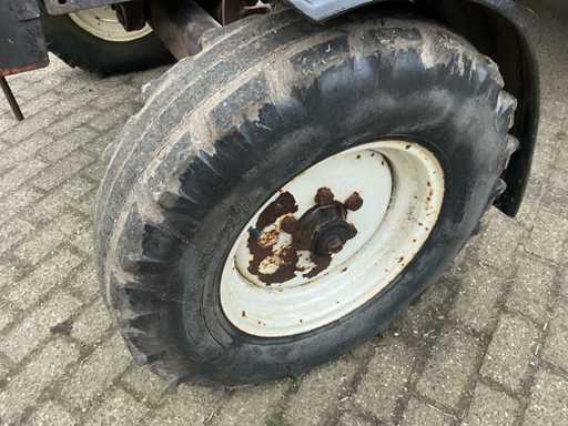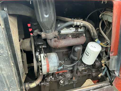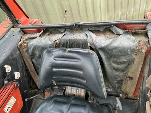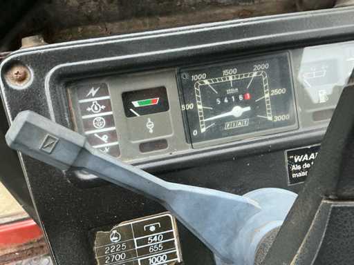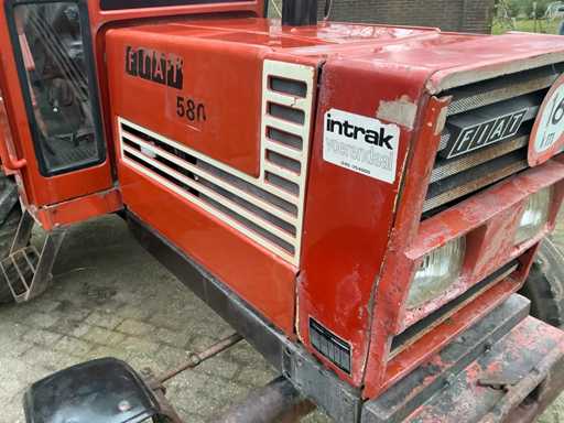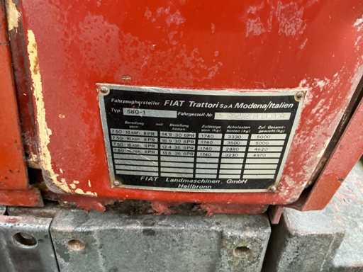 Voorzien van: Fiat 580 landbouwtractor met 3-cilinder dieselmotor van ca. 58 pk, handgeschakelde transmissie, PTO 540 t/min, 3-puntshef, originele CS7-veiligheidscabine met kenteken,