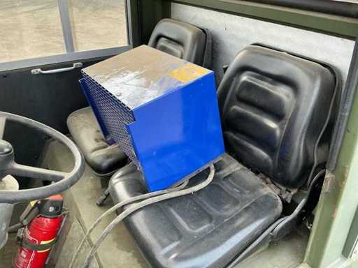 Voorzien van: 2 persoons, brandblusser, acculader, verlichting, koppelpunt voor-en achter, ruitenwissers, noodstop, werkverlichting, dieseltank, hydraulische aansluiting