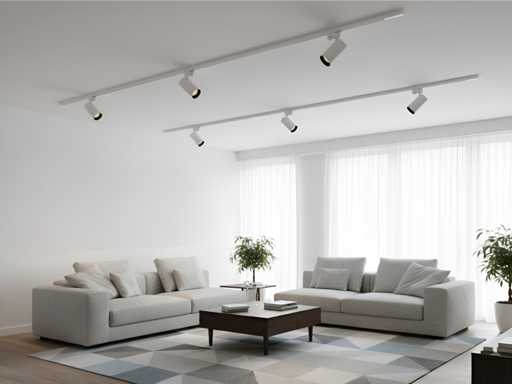 2 stuks 1 fase 2 draad 100cm rail, materiaal aluminium, bevestiging inclusief, 220-240V, afdichting IP20, 1 stuk door verbinder, product kleur zand wit en zwart, 6 stuk railspots GU10 armatuur afm. Ø 60 x 120mm draaibaar 350° en kantelbaar 90°, bulb niet inbegrepen, de rail kan eenvoudig op de gewenste lengte worden gezaagd, geschikt voor binnen, SKU 902 SKU 906 SKU 826