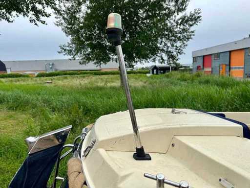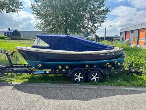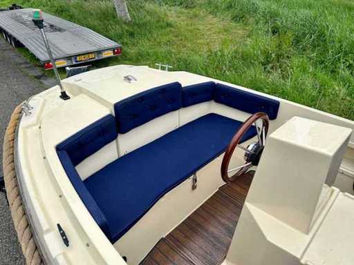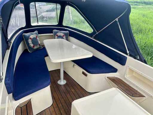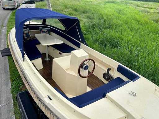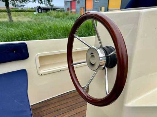 Clever Viking 565 met een 9.9 pk Tohatsu 4 takt elektrisch gestart in de bun. De complete buiskap inclusief achterzeil is recent vernieuwd! Voorzien van een nette teakvloer. Compleet met een luxe kussenset, uitneembaar zonnedek, tafel, RVS zwemtrap en 12V aansluiting. Betreft een royale en stabiele sloep.