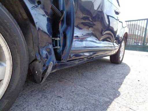 Voertuig is aan de linkerkant gecrasht. Zwaar beschadigde bestuurdersdeur, linker voorspatbord en tuimelpanelen vervormd.