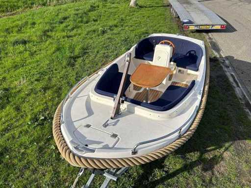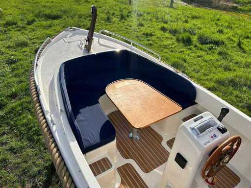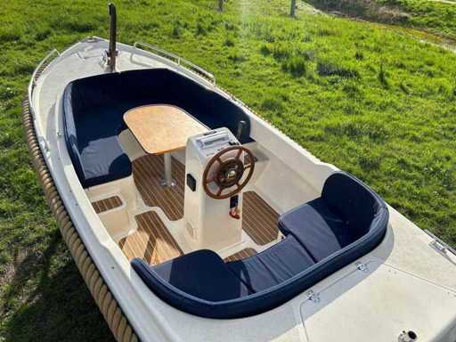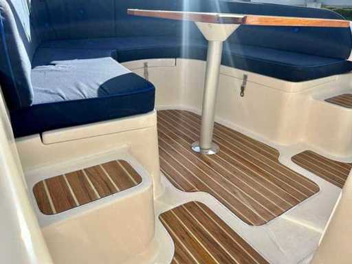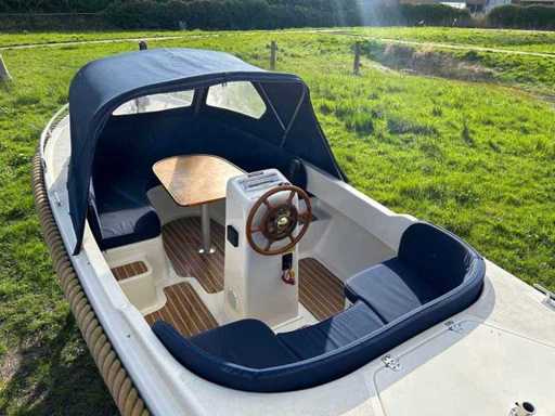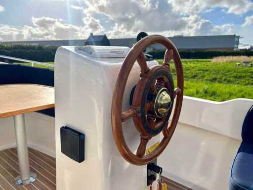 Compleet met onder andere: een buiskap met achterzeil, stoffen kussenset, gaspit, RVS zwemtrap, 12V aansluiting, teaktafel met poot, instaptreden met teaklook, teaklookvloer, automatische bilgepomp, navigatieverlichting en een toplicht.