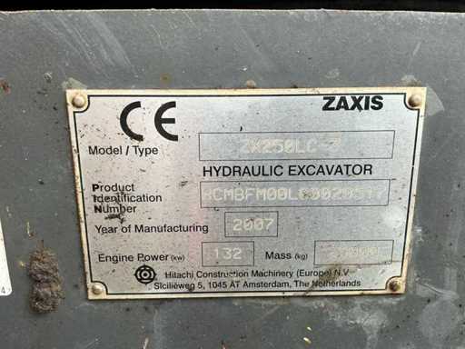 Voorzien van: Aansluiting CW30. Achteruitrijd camera, Hydraulische snelwissel, climate control. , 2 rijsnelheden, luchtgeveerde stoel, stoelverwarming, Hitachi ZAXIS ZX250LC-3 hydraulische rupsgraafmachine uit 2007 met Isuzu dieselmotor van 132 kW (±180 pk), bedrijfsgewicht ca. 25.900 kg, LC-onderwagen, bakinhoud ca. 0,9–1,4 m³, max. graafdiepte ±6,7 m, max. bereik ±10 m, rijsnelheid ca. 5,5 km/u, zwenksnelheid ±11,5 rpm en CE-markering.